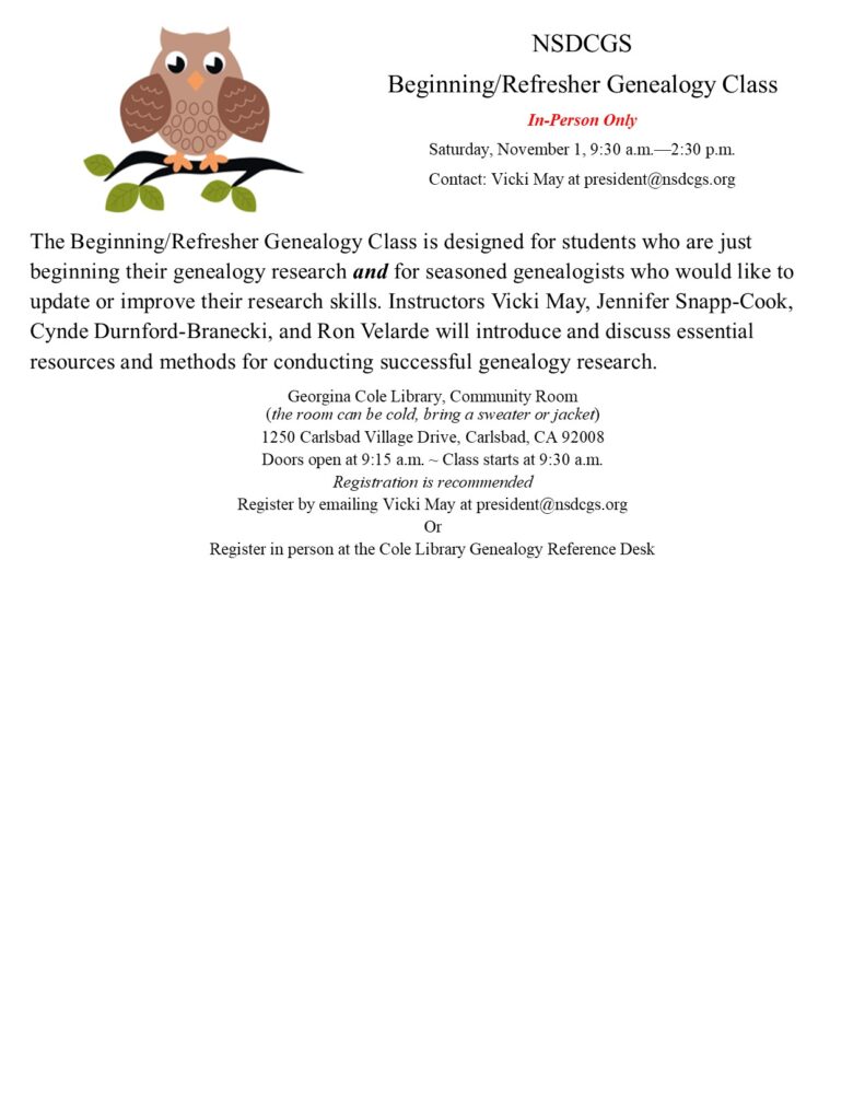 Presented by NSDCGS in partnership with the Carlsbad City Library, students cover the essentials of genealogy research: getting started, record keeping, census records, wills & probate, land records, Internet resources and genealogy software. These classes are great for beginners or those looking for a refresher on the fundamentals.